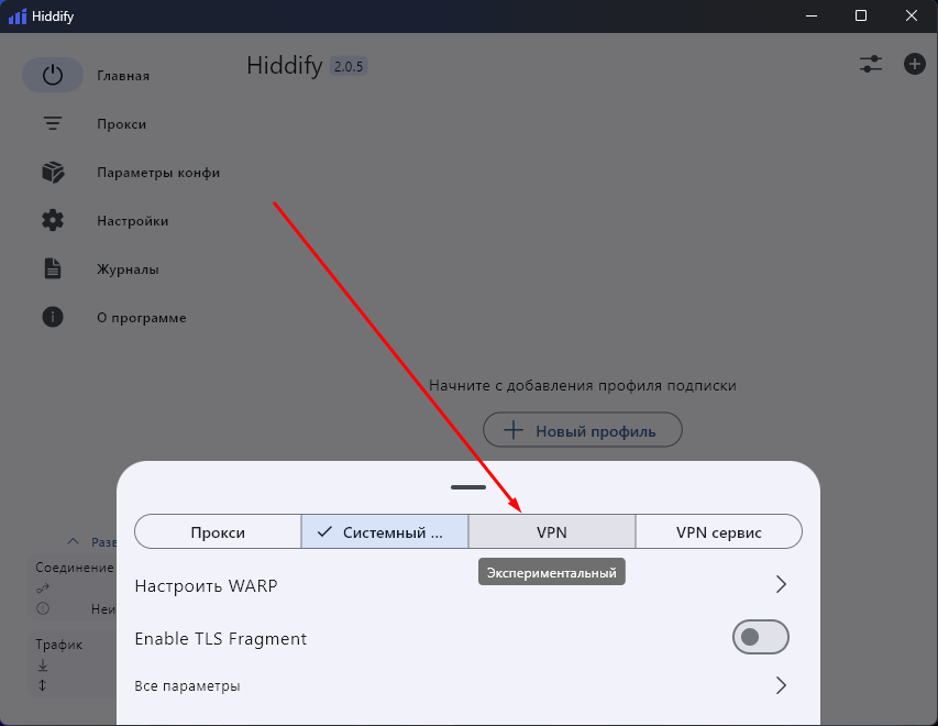 - Системный прокси - то же что и просто прокси, но hiddify автоматически устанавливает настройки прокси в параметрах ОС. Некоторые программы (например браузер) умеют автоматически находить и использовать настройки системного прокси, но иногда может потребоваться дополнительная настройка.